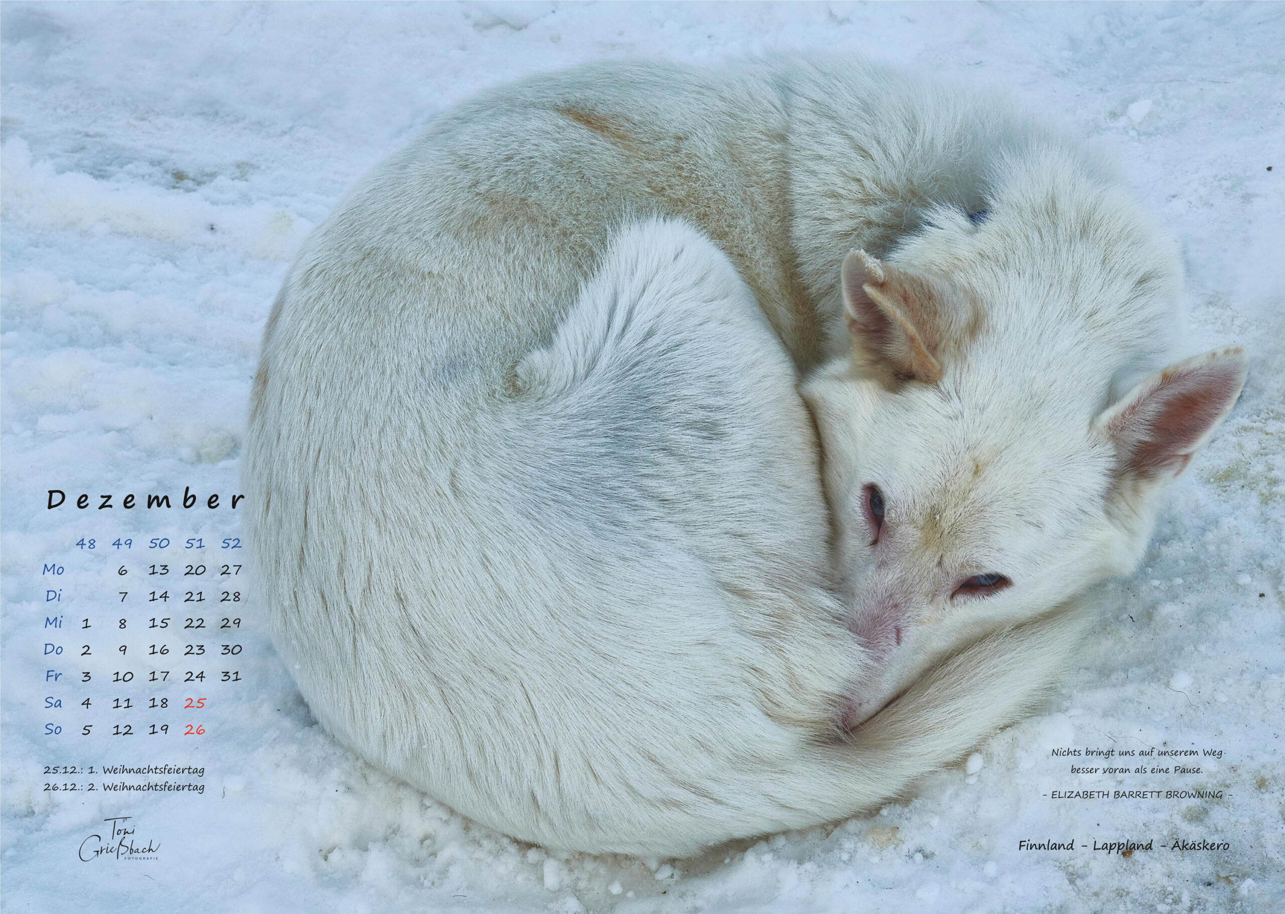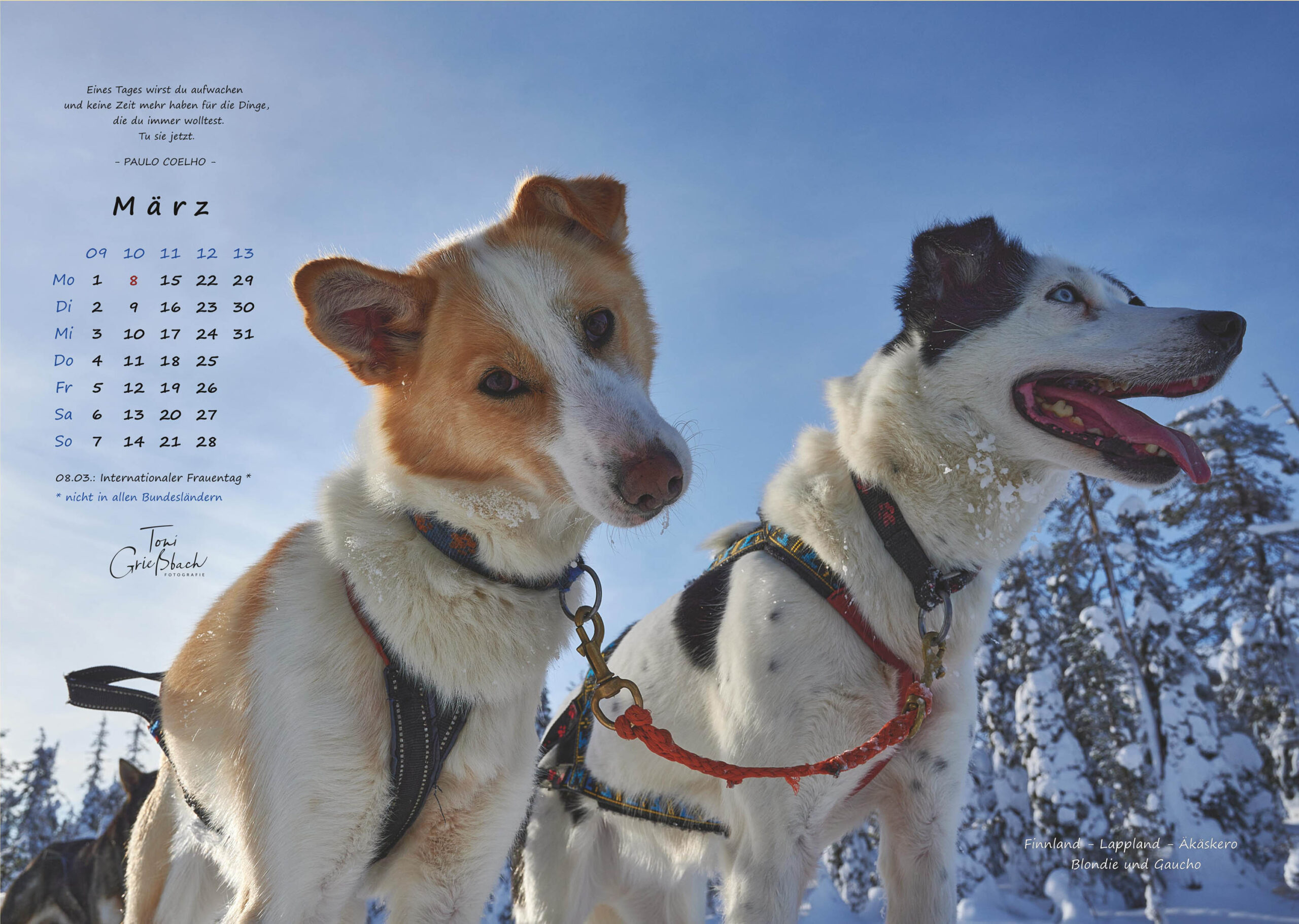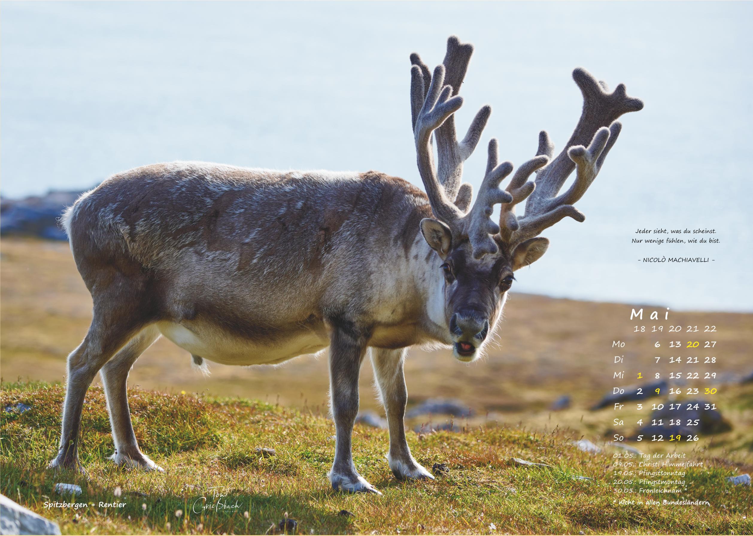Der Bildkalender im Format 30cm x 42cm, in hochwertigem Druck zeigt Fotos aus von Leben jenseits der Polarkreise. 12 Monate mit beeindruckenden Aufnahmen und passenden Zitaten.