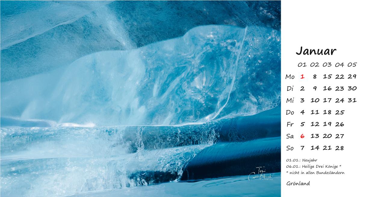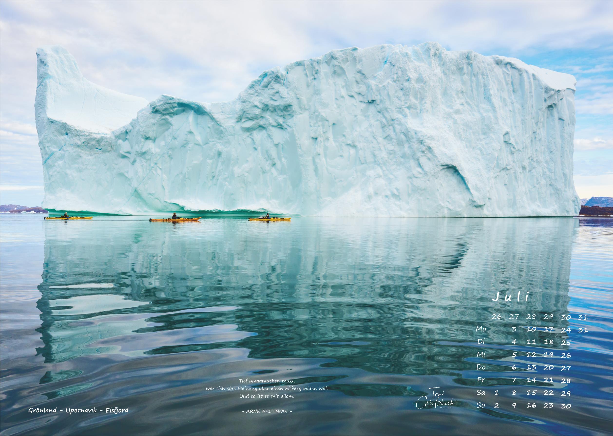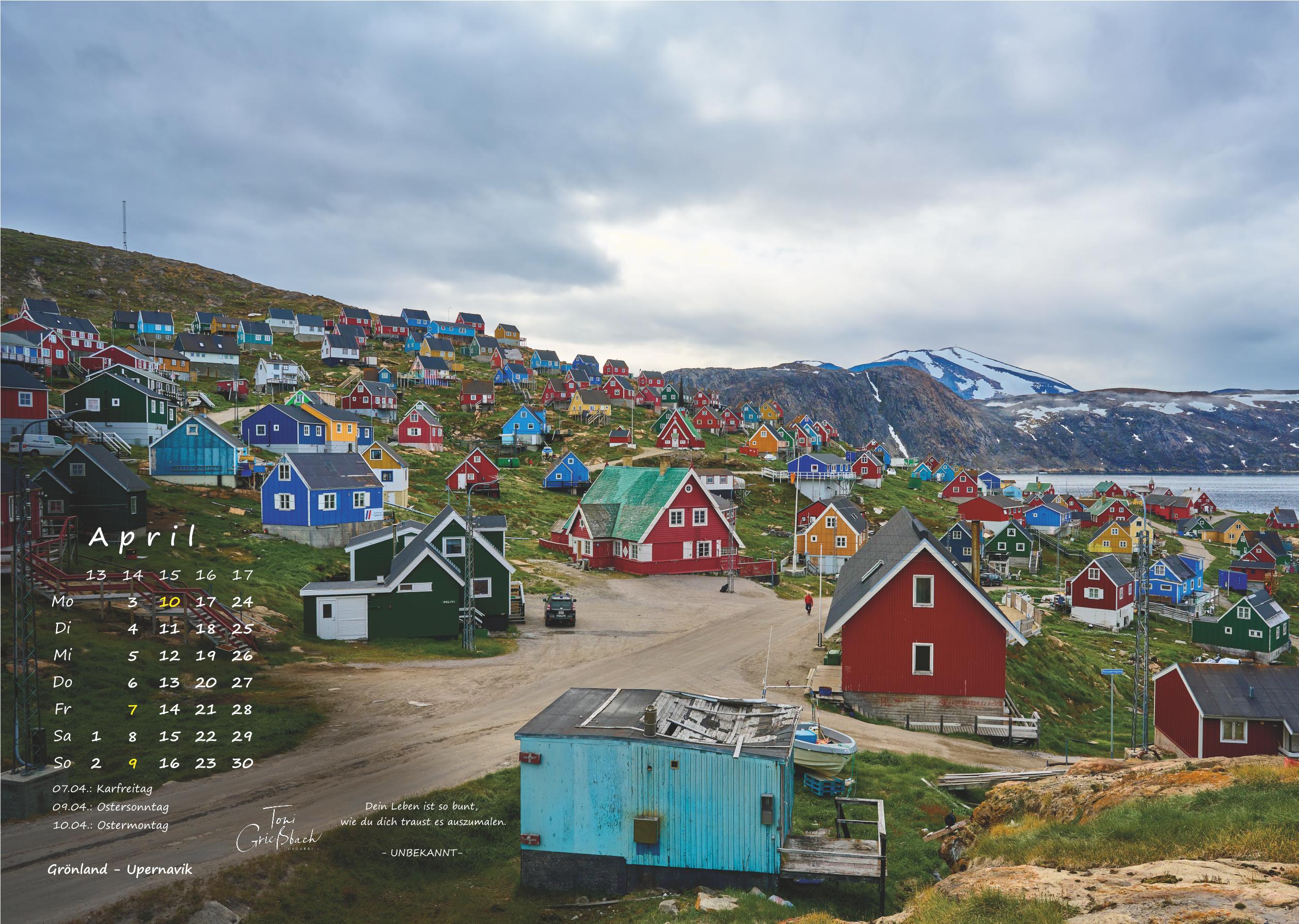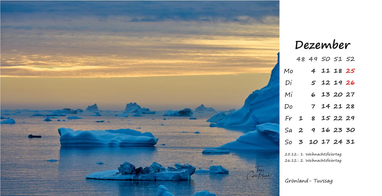Der Bildkalender im Format 30cm x 42cm, in hochwertigem Druck zeigt Fotos aus Grönland, 12 Monate mit beeindruckenden Landschaften, Menschen und Naturaufnahmen.