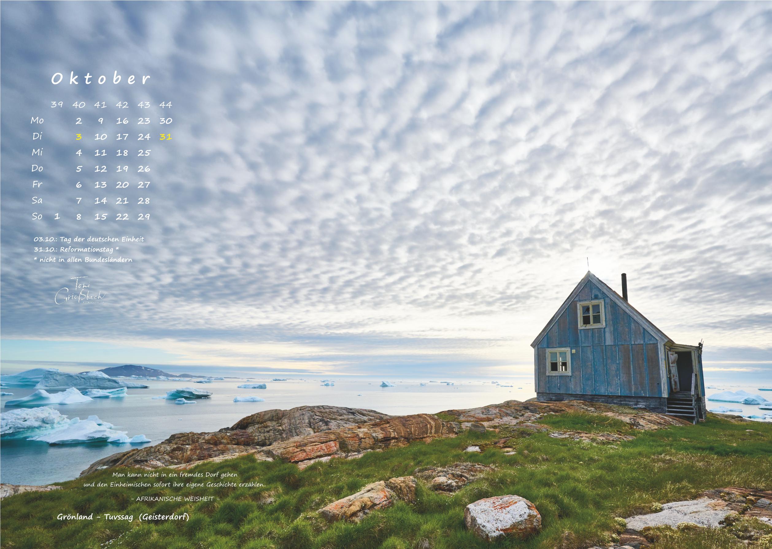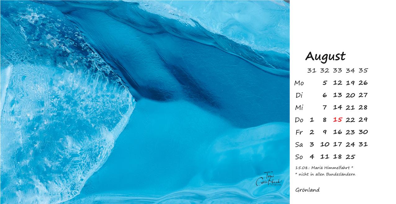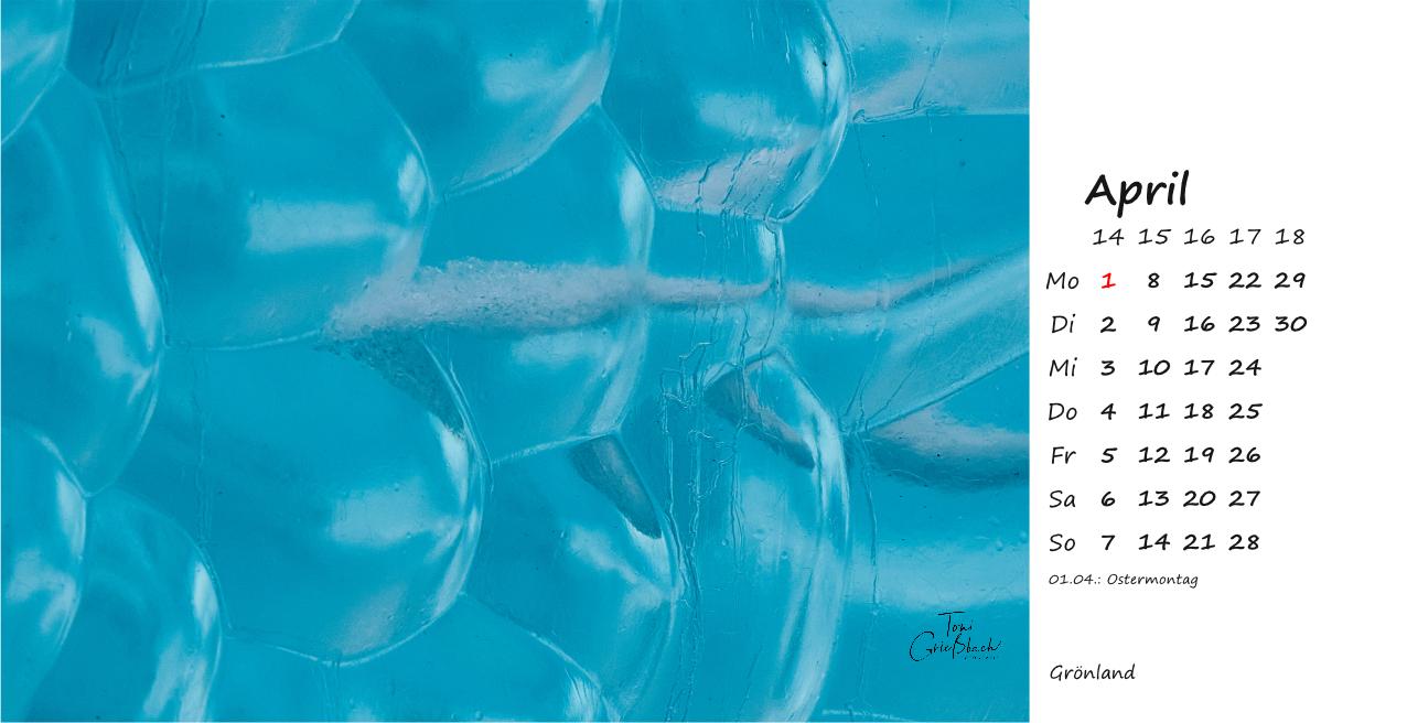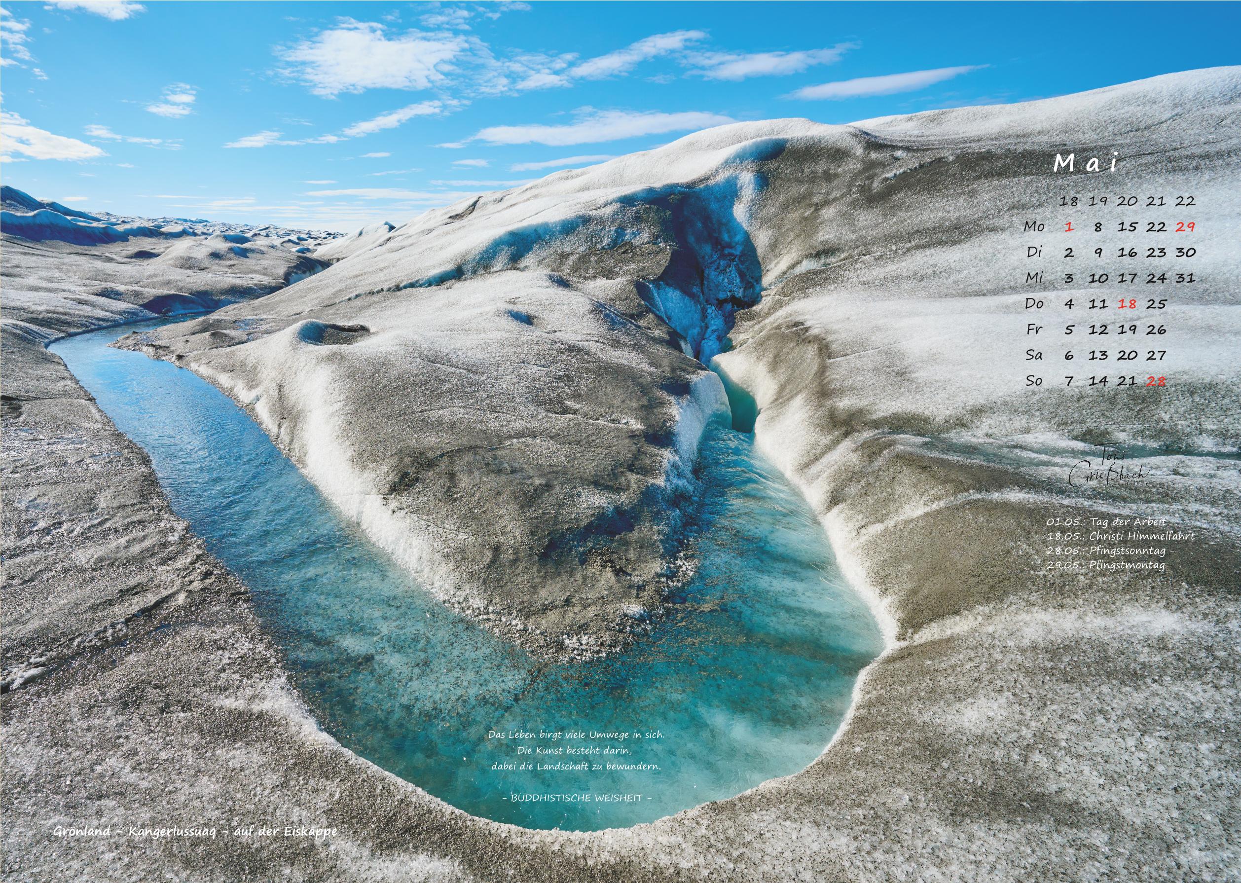 Der Bildkalender im Format 30cm x 42cm, in hochwertigem Druck zeigt Fotos aus Grönland, 12 Monate mit beeindruckenden Landschaften, Menschen und Naturaufnahmen.